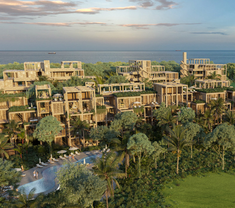 El diseño de nuestros espacios busca un equilibrio formal y un diálogo entre los diferentes materiales naturales. La piedra, el chukum y las maderas locales se fusionan con nuestro paisajismo, componiendo ambientes nobles y serenos en todo el desarrollo.